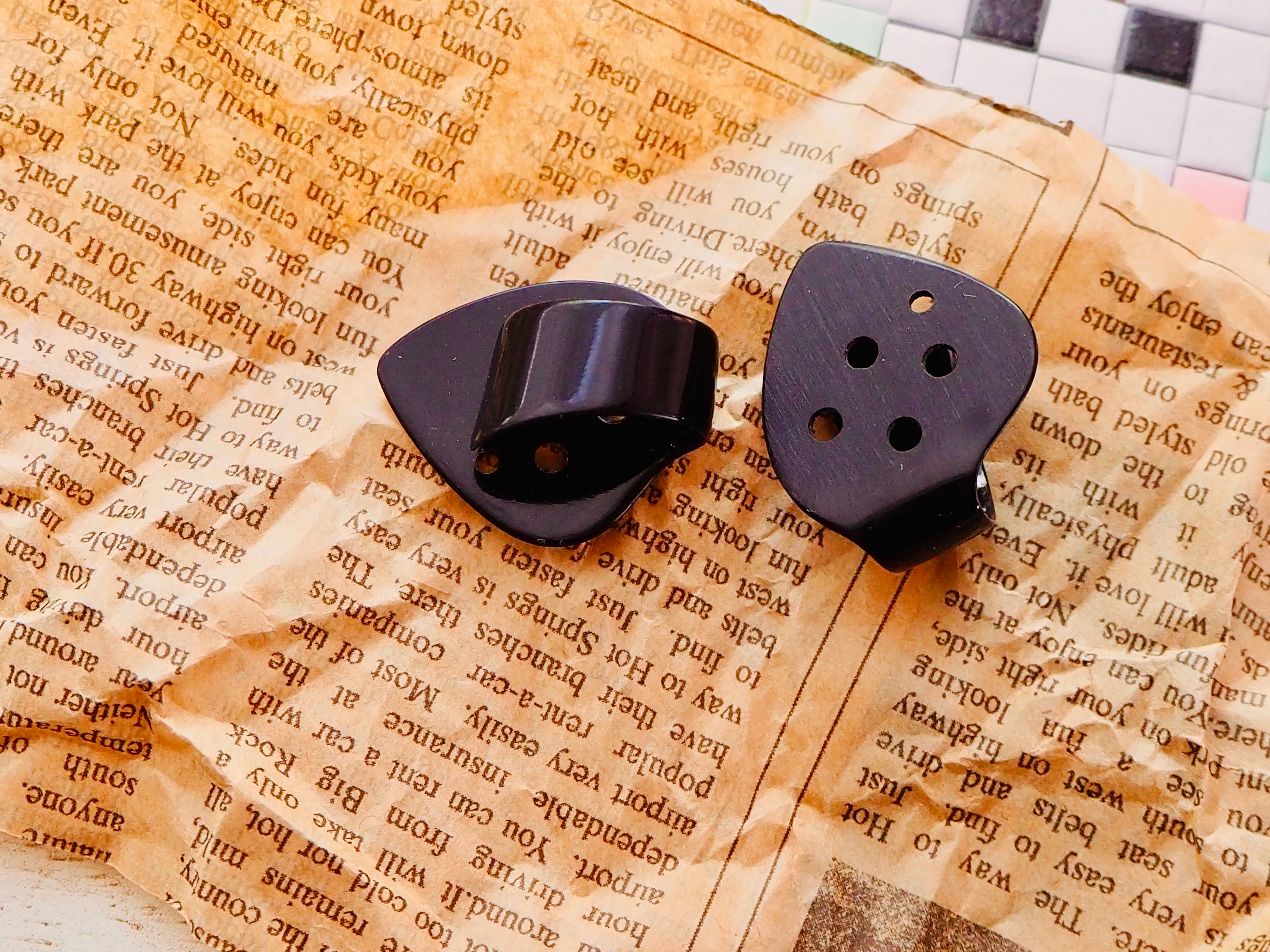 一般的なサムピックより柔らかくて、形状はティアドロップ型です。少し小さめかな。